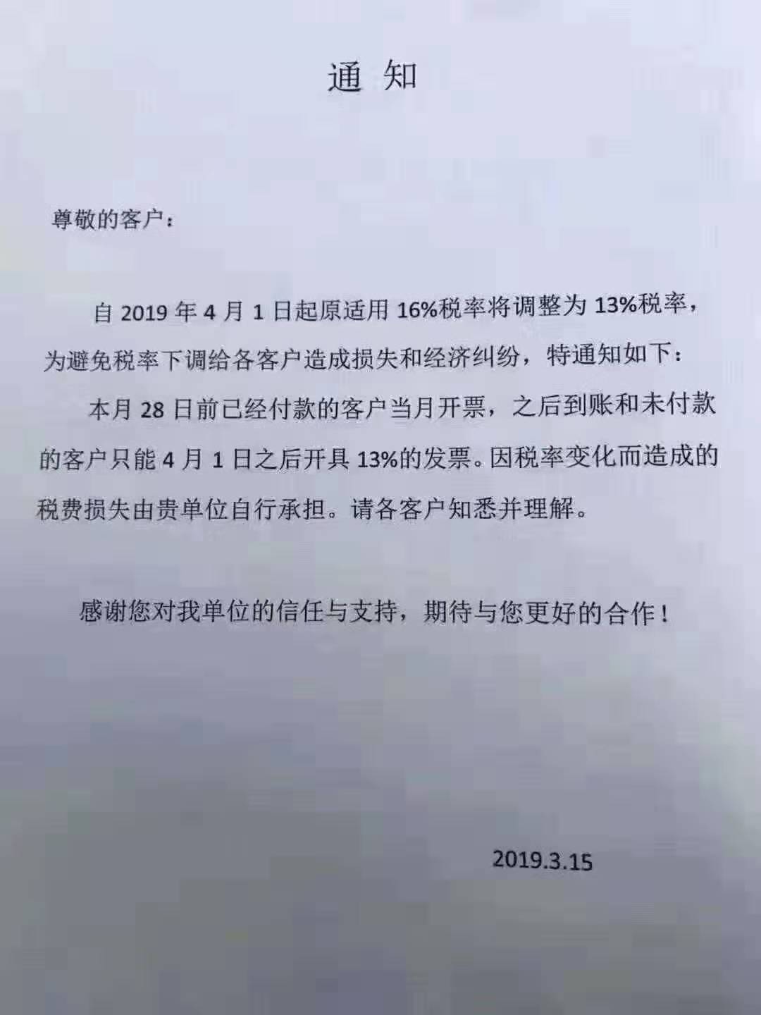湖北程力公司財務重要通知:本月20號以后暫停開票,增值稅稅率,四月起將由16%改成13%。請:之前與我司有合同16%稅率發票的客戶,將款項轉入我公司賬戶,以便我司近期將16%發票開給您。