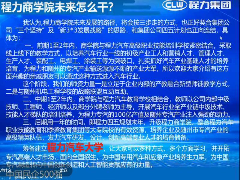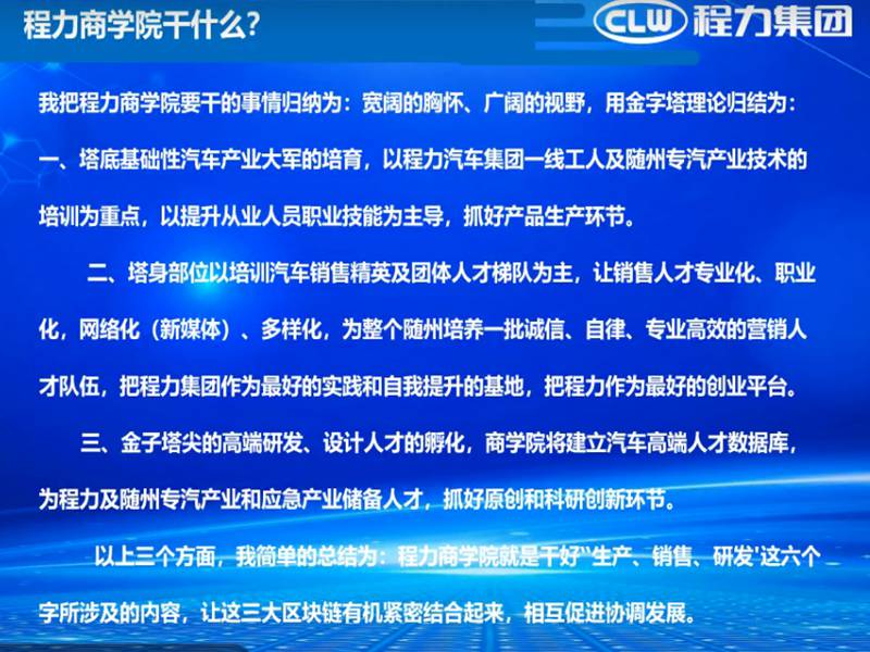 2020年確是一個不同尋常的一年,一場新型冠狀病毒感染的肺炎疫情席卷全國,牽動著億萬國人的心。湖北程力作為中國民營500強企業(yè),公司領導多次為隨州捐款,捐物。為隨州百姓做貢獻。在疫情期間程力商學院組織各專業(yè)廠技術(shù)專家講師為程力汽車銷售經(jīng)理提供釘釘在線網(wǎng)上產(chǎn)品業(yè)務知識培訓學習。下面是程力汽車集團公司總經(jīng)理董事長程阿羅在程力商學院開播致辭網(wǎng)路連線圖片: ![]() 總經(jīng)理在會上闡述: A:什么是程力商學院? 程力汽車集團股份有限公司的主要四大業(yè)務矩陣,即:汽車、金融、教育、投資。 這四大產(chǎn)業(yè)矩陣中,汽車是涵蓋專用汽車、商用車、新能源汽車、客車、汽車零部件,微卡、輕卡、中卡、重卡、皮卡底盤及整車的研發(fā)生產(chǎn)與銷售,以及應急專用汽車的產(chǎn)業(yè)全方位產(chǎn)業(yè)建設、配套與生產(chǎn)營銷。 金融作為企業(yè)發(fā)展的血脈,也主要是圍繞著以汽車產(chǎn)業(yè)進行匹配和支撐;第三個增長極,就是我們的教育矩陣,這也是為程力的汽車產(chǎn)業(yè),乃至為隨州作為中國專汽之都的大工業(yè),做汽車產(chǎn)業(yè)基礎人才培訓和高端研發(fā)設計、營銷人才的孵化提升;當然,作為資本的逐利的本質(zhì)屬性,公司也會對前瞻性、新興高科技產(chǎn)業(yè)和國家鼓勵的戰(zhàn)略性支柱產(chǎn)業(yè)做適當?shù)耐顿Y。 明白了這些思路,我們就可以很好的理解什么是程力商學院了。 簡單的講,程力商學院就是以汽車研發(fā)生產(chǎn)銷售為主要內(nèi)容,進行學習交流的職業(yè)教育平臺,它分為線上網(wǎng)絡直播課堂學習及線下實體培訓學習的兩種方式,商學院匯聚了社會各界的專家、教授,智囊、企業(yè)家、行業(yè)泰斗、營銷精英及政商高端人才,是汽車產(chǎn)業(yè)發(fā)展的知識寶庫和動力源泉,商學院從2018年籌建上線,至今已2年 B: 程力商學院干什么? 程力商學院要干的事情歸納為:寬闊的胸懷、廣闊的視野,用金字塔理論歸結(jié)為: 一、塔底基礎性汽車產(chǎn)業(yè)大軍的培育,以程力汽車集團一線工人及隨州專汽產(chǎn)業(yè)技術(shù)的培訓為重點,以提升從業(yè)人員職業(yè)技能為主導,抓好產(chǎn)品生產(chǎn)環(huán)節(jié)。 二、塔身部位以培訓汽車銷售精英及團體人才梯隊為主,讓銷售人才專業(yè)化、職業(yè)化,網(wǎng)絡化(新媒體)、多樣化,為整個隨州培養(yǎng)一批誠信、自律、專業(yè)高效的營銷人才隊伍,把程力集團作為最好的實踐和自我提升的基地,把程力作為最好的創(chuàng)業(yè)平臺。 三、金子塔尖的高端研發(fā)、設計人才的孵化,商學院將建立汽車高端人才數(shù)據(jù)庫,為程力及隨州專汽產(chǎn)業(yè)和應急產(chǎn)業(yè)儲備人才,抓好原創(chuàng)和科研創(chuàng)新環(huán)節(jié)。 以上三個方面,我簡單的總結(jié)為:程力商學院就是干好“生產(chǎn)、銷售、研發(fā)'這六個字所涉及的內(nèi)容,讓這三大區(qū)塊鏈有機緊密結(jié)合起來,相互促進協(xié)調(diào)發(fā)展。 C程力商學院未來干什么? ![]() 公司總經(jīng)理程阿羅對商學院的殷切希望 ![]() 程力商學院網(wǎng)上第一期(疫情期間)培訓學習結(jié)束語: “沉舟側(cè)畔千帆過,病樹前頭萬木春”,走過黑暗我們必將迎來光明;走過黑暗我們必將更加美好!疫情帶給我們暫時的困難,只要我們不忘初心任重道遠堅如磐石,我們一定會更加眾志成城逆勢而上再創(chuàng)佳績。 大家一定要知道,疫情過后,國家一定會加大投資,未來五年,將是創(chuàng)業(yè)者最佳的機會,所以現(xiàn)在大家就要加強學習,為隨時迎接經(jīng)濟繁榮、市場擴大做好準備。 程力一定要為有準備者提供最好的創(chuàng)業(yè)平臺,只要你有夢想、無論你是想帶團隊做銷售還是想帶團隊成為專業(yè)廠做專業(yè)產(chǎn)品,程力的三個廠區(qū)都能為你帶來最好的創(chuàng)業(yè)環(huán)境,或者自己有廠房想加入程力,程力一定為你提供最好的服務團隊,最大的銷售市場,最響亮的品牌,一定幫你實現(xiàn)你的夢想,沒有什么不可實現(xiàn),只怕你不去一點點學習,在程力找到自己的定位然后再突破。 同志們,我相信有了程力商學院和大家共同進步,大家的夢想都一定能實現(xiàn)。 程力汽車集團2020年3月8日 |