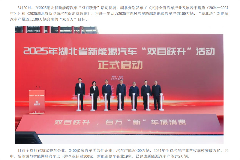 3月19日 (下午)三部門聯合升級貨車更新政策:交通運輸部、發改委、財政部將老舊貨車補貼范圍擴展至國三/國四排放車輛,取消燃料類型限制。根據新規,提前報廢并更換新能源貨車的企業最高可獲14萬元/車補貼,購置國六車型補貼7萬元。政策特別設置"綠色通道",對參與氫燃料電池車示范運營的企業額外給予3萬元運營補貼。支持資金按照總體9:1的原則實行央地共擔。 3月20日 湖北省確定汽車產業“雙百萬”目標 湖北省分別發布了《支持全省汽車產業發展若干措施(2024—2027年)》和《2025湖北省新能源汽車促消費政策》,將進一步助力2025年“湖北造”新能源汽車產量邁上100萬輛臺階的目標。 3月21日 大同構建新能源商用車生態圈 3月29日 央企重組開啟產業新格局 3月,財政部的扶持政策不僅延長了購置稅減免期限,還加大了對充換電基礎設施和智能網聯技術的投入,為新能源專用車的市場推廣和基礎設施建設提供了有力保障。此外,三部門聯合升級的貨車更新政策,提供了豐厚的補貼,將促進新能源專用車的銷售。湖北省確定汽車產業“雙百萬”目標不僅為當地提供了政策支持和市場需求保障,還促進了產業鏈的協同發展和新能源專用車的普及推廣。這一系列政策將有助于推動新能源專用車產業的快速發展和壯大。 |