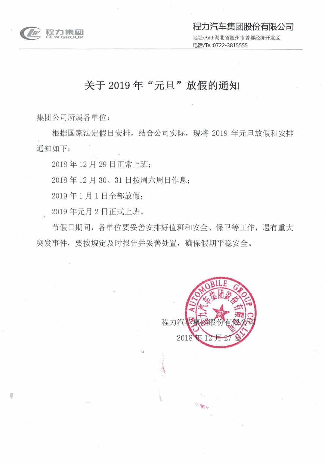 | 湖北程力汽車集團(tuán)2019年元旦放假通知: |