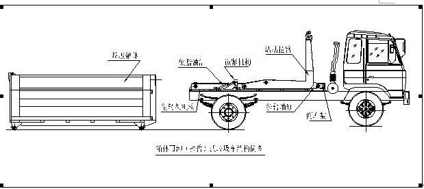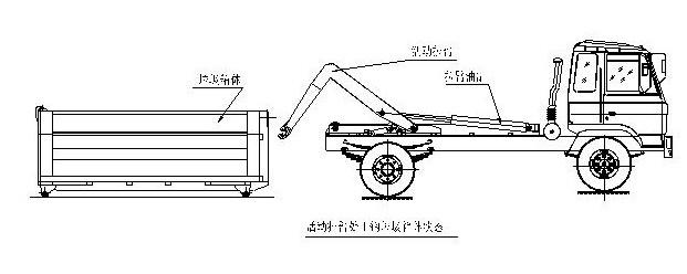 拉臂式垃圾車(車廂可卸式垃圾車)使用說明 一、概述 什么是勾臂垃圾車? 車廂可卸式垃圾車又稱拉臂式垃圾車(以下簡稱垃圾車)是用于城鎮袋裝、散裝生活垃圾物的收集、運輸、卸料作業的專用車輛。 該車是由汽車底盤、拉臂主油缸、附車架、翻轉架、支撐腿(選裝)、鎖緊架、鎖緊油缸及多路換向閥等組成。翻轉架一端連在附車架上,其另一端設有活動拉臂,中間安裝有鎖緊系統;活動臂油缸一端連在活動臂上,另一端連接在附車架上;鎖緊機構通過鎖緊油缸的動作可以在箱體自卸時將附車架上的箱體與翻轉架及拉臂連為一體,在主油缸伸出時形成自卸角,也可以通過鎖緊油缸的收回把翻轉架與附車架鎖緊為一體,利用主油缸的收回或伸出使活動拉臂將地下的垃圾箱拖拉至附車架上或從附車架上放回到地面。 該車可將地下垃圾箱內的垃圾及垃圾箱一同拉至車上運走同時可自卸,降低了工人的勞動強度。該垃圾車的收運方式是目前世界上廣泛采用的垃圾收運方式,可以實現一車多箱,大大降低了配備成本和空間等等;其專用裝置的功能均以汽車發動機為動力,通過液壓機構手動或電控來實現。車輛的箱體采用優質炭鋼板全密封焊接結構,具有強度高、重量輕、不產生二次污染等優點。 二、結構簡圖 三、操作步驟 在裝載垃圾前,空載運轉達到6個標準氣壓時,掛上取力器(駕駛室內方向盤左下方),檢查各部件有無泄漏或異常后,再按照操作指示牌指示位置進行操作;其具體操作步驟如下: 拉起垃圾箱體 步驟1.將鎖緊鉤操作手柄推至收回位置,鎖緊油缸收回,使鎖緊架收回并將翻轉架與附車架鎖緊固定;如圖: 步驟2.將拉臂操作手柄拉起到伸起位置,拉臂油缸伸出,活動拉臂繞翻轉翻轉架前鉸鏈軸旋轉,拉臂處于鉤箱位置,適當調整拉臂鉤高度并與箱體彎鉤對準;如圖: